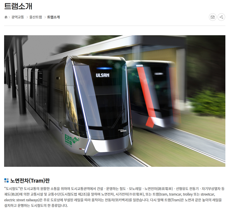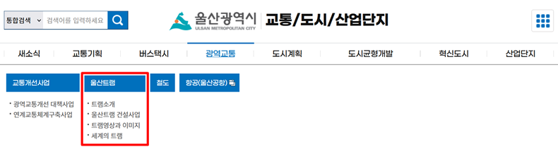 교통 관련 페이지 상단에 위치한 세부 탭 메뉴에서 '광역교통' 항목을 지정한 뒤 하단에 나타나는 '울산트램' 영역을 확인합니다. 이곳에는 노면전차에 대한 기초 지식부터 실제 건설 사업의 진행 현황 그리고 시각적인 노선 자료 등이 하위 메뉴로 구성되어 있습니다. 사업의 구체적인 실행 계획을 파악하기 위해 관련 항목을 순차적으로 선택하여 수치와 내용을 습득합니다.