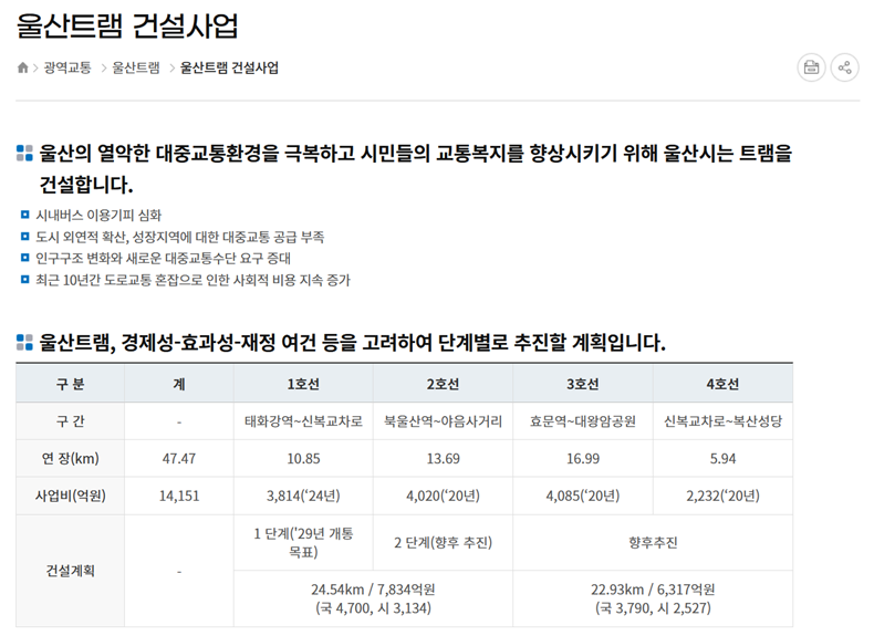 '울산트램 건설사업' 항목에서는 사업 추진의 필요성과 1호선부터 4호선까지의 단계별 수립 계획을 도표로 상세히 파악합니다. 경제성과 재정 여건을 고려하여 총 47.47킬로미터 구간을 구축할 계획이며, 1호선은 태화강역에서 신복교차로까지 연결되는 구간으로 설정되었습니다. 각 노선별 연장 거리와 투입 예산 그리고 개통 목표 연도가 명확한 수치로 정리되어 있습니다.