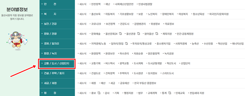 분야별정보 안내 페이지로 진입하면 시청에서 처리하는 각종 업무가 카테고리별로 나열된 것을 확인할 수 있습니다. 나열된 항목들 중 교통 정책과 도시 계획을 관장하는 '교통 / 도시 / 산업단지' 메뉴를 찾아 선택합니다. 해당 영역은 시민의 이동권 보장 및 도시 개발과 관련된 다양한 대형 프로젝트의 정보를 심도 있게 다루는 행정 안내 구역입니다.