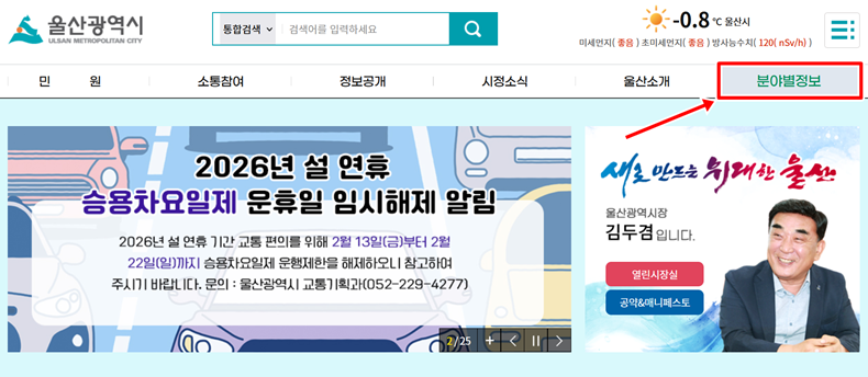 광역 교통망에 대한 자료를 처음 찾는 과정에서 어떤 경로로 접근해야 할지 혼란을 느낄 수 있습니다. 검색을 통해 '울산광역시' 홈페이지로 접속하신 뒤, 행정 전반의 세부 정보를 확인할 수 있는 메인 화면을 살핍니다. 우측 상단 영역에 배치된 '분야별정보' 항목을 선택하여 이동합니다. 시정 업무를 성격에 따라 체계적으로 분류하고 있는 이 메뉴를 통해 원하는 교통 사업 자료를 찾는 첫 단계를 수행합니다.