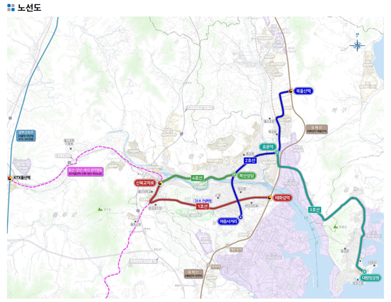 '노선도' 메뉴를 선택하면 각 호선이 통과하는 세부 경로와 주요 정차역의 지리적 위치를 시각 자료로 확인할 수 있습니다. 울산의 동서남북을 유기적으로 잇는 전체 철도망 구조가 표시되어 있으며, 기존 국철이나 도시철도와의 환승 지점도 명확히 기재되어 있습니다. 이를 통해 향후 대중교통 체계의 변화 양상을 공간적으로 분석하고 예측하는 것이 가능합니다.