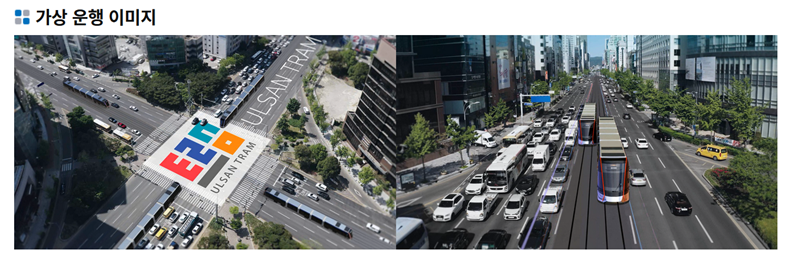 '가상 운행 이미지'에서는 실제 도심 도로 환경에 노면전차 시스템이 도입되었을 때의 시각적 변화를 미리 확인합니다. 복잡한 교차로나 주요 대로변에서 차량과 조화를 이루며 주행하는 모습이 가상으로 구현되어 있습니다. 이는 물리적인 노선 구축 외에도 실제 이용자가 현장에서 체감하게 될 도시 경관의 개선 효과와 교통 체계의 현대화 수준을 가늠하게 돕는 자료입니다.