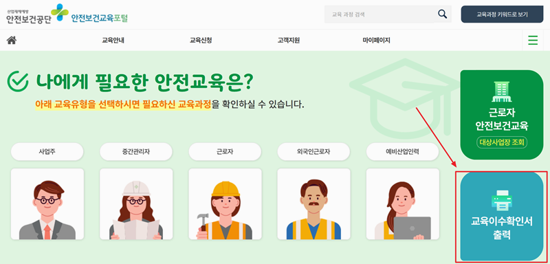 1. 건설 기초안전교육을 비롯한 다양한 안전 교육 정보를 확인하고 신청할 수 있는 곳입니다. 교육 이수 내역 조회와 이수증 재발급도 가능해 필요한 정보를 쉽게 찾아볼 수 있습니다. 정확한 절차와 안내가 제공되니 이수증이 필요할 때 한 번쯤 확인해보는 것이 좋습니다. 우측의 교육이수확인서를 눌러서 이수증을 출력 할 수 있어요.