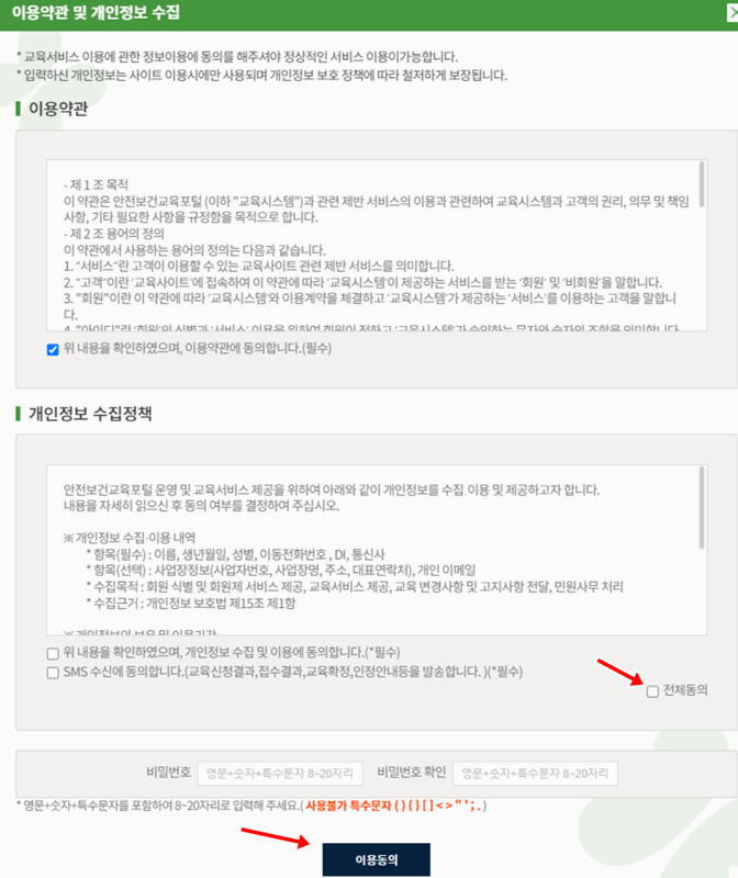 4. 로그인 후에는 이용약관과 개인정보 수집 정책에 대한 동의 절차가 필요합니다. 전체 동의를 완료한 뒤 비밀번호를 입력하면 서비스 이용이 가능합니다.