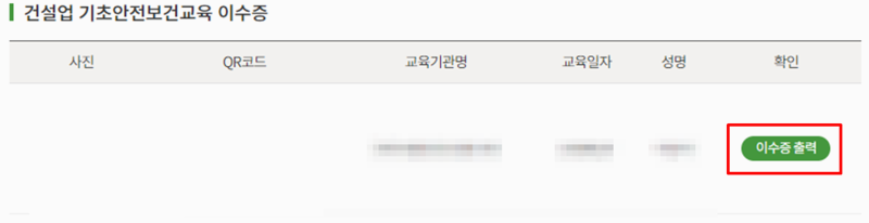 5. 약관 동의를 완료한 후 본인 인증을 거치면 이수증을 조회하고 출력할 수 있습니다. 이수증은 건설업 기초안전보건교육을 이수했다는 공식적인 증빙 자료로 사용됩니다.