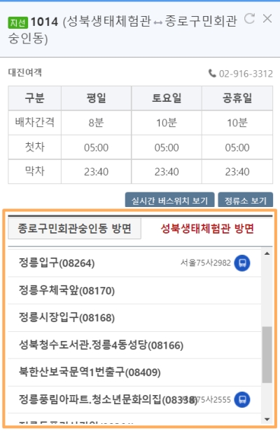 버스 번호를 선택하면 더 상세한 정보를 볼 수 있어요. 화면 왼쪽에는 종로구민회관 방면, 성북생태체험관 방면처럼 운행 방향별로 전체 정류소 목록이 쭉 나열돼요. 내가 타야 할 정류장이 어디쯤 있는지, 그리고 앞으로 몇 개의 정류장을 더 지나야 하는지 한눈에 파악할 수 있어서 정말 편리했어요.