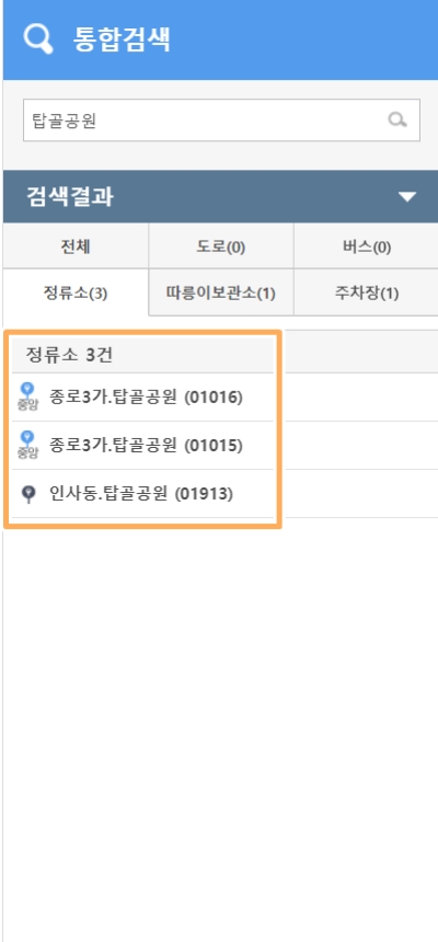 버스 번호가 아닌, 정류장 이름으로도 검색할 수 있어요. 예를 들어 '탑골공원'을 검색하니, 근처에 있는 여러 버스 정류장이 목록으로 나타나더라고요. 같은 이름의 정류장이라도 중앙차로인지 가변차로인지, 그리고 고유 번호가 어떻게 다른지 구분해서 보여주니 헷갈리지 않고 찾을 수 있었답니다.