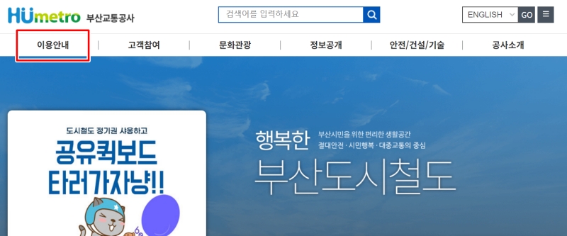 부산 여행을 계획하다 보면 이동 수단이 가장 고민되기 마련인데 포털 창에서 '부산교통공사'를 찾아 홈페이지에 들어온 다음 상단 메뉴에 있는 이용안내를 선택해 보세요. 저는 부산에 갈 때마다 이곳에서 정보를 얻기 시작하는데 첫 화면부터 깔끔하게 정리되어 있어 길 찾기가 훨씬 수월해지는 기분을 느낄 수 있었어요.