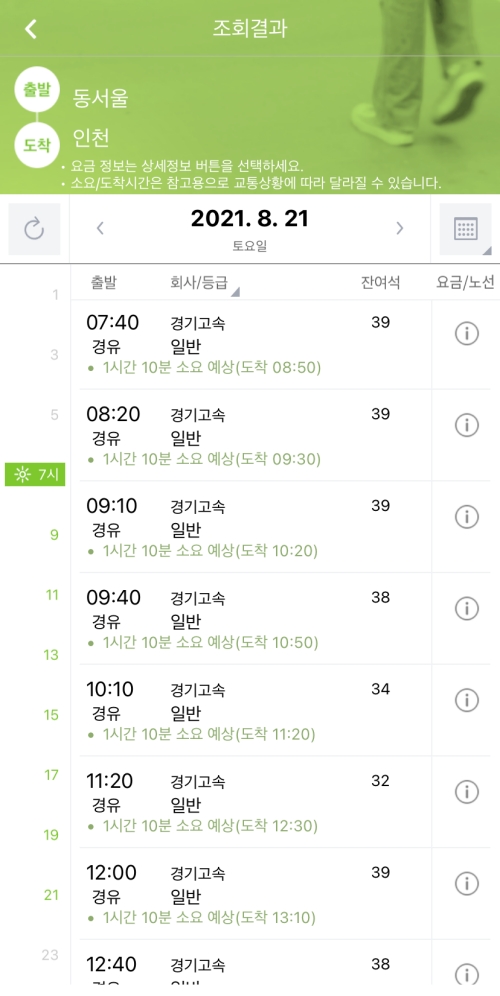조회가 끝나면 내가 설정한 조건에 맞는 버스들이 시간순으로 쭉 나타나요. 동서울에서 인천으로 가는 버스를 찾아보니, 아침 7시 40분부터 거의 30분 간격으로 차편이 있는 것을 확인할 수 있었어요. 출발 시간과 예상 소요 시간, 남은 좌석까지 한눈에 볼 수 있어서 정말 편리했답니다.