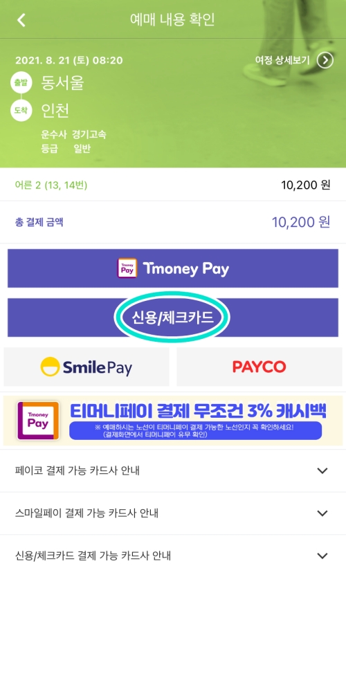 마지막으로 결제만 남았네요. 예매 내역을 다시 한번 꼼꼼히 확인한 뒤, 여러 결제 수단 중에서 내가 사용할 '신용/체크카드'를 선택해주세요. 티머니페이나 페이코 같은 간편결제 서비스도 이용할 수 있답니다.