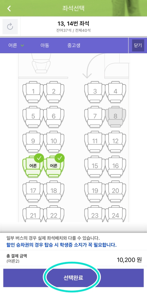 이제 원하는 좌석을 직접 선택할 차례예요. 버스 좌석 배치도가 화면에 나타나면, 앉고 싶은 자리를 선택해주세요. 어른, 아동, 중고생 등 탑승 인원을 설정하고 '선택완료'를 누르면 결제 단계로 넘어갈 수 있답니다.