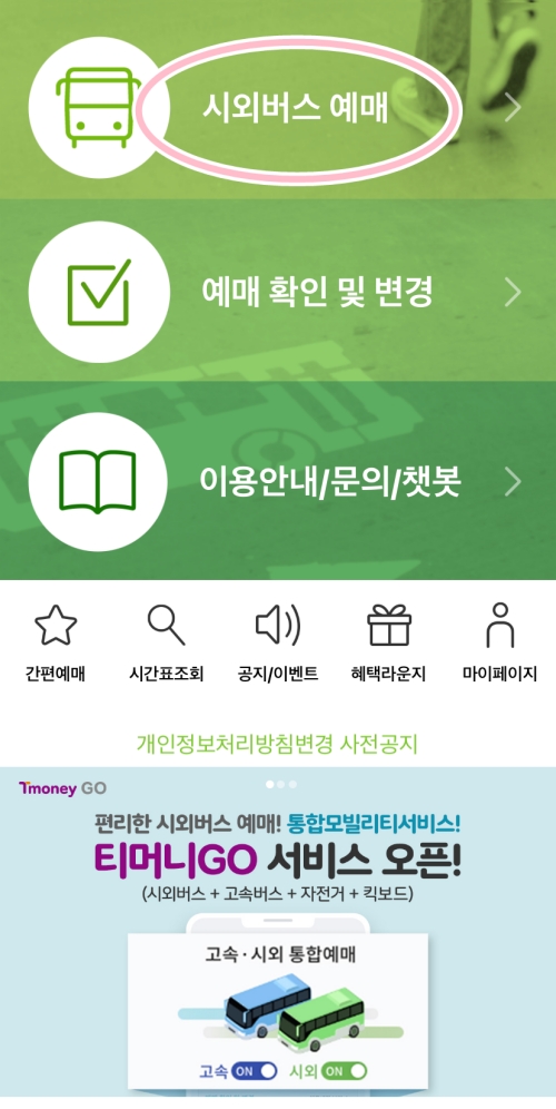앱을 실행하면 여러 메뉴가 보이는데요. 우리는 지금 당장 표를 구해야 하니, 망설일 필요 없이 가장 위에 있는 '시외버스 예매'를 선택해주세요. 이곳에서 출발지와 도착지를 설정하고 원하는 시간의 버스를 찾아볼 수 있어요.