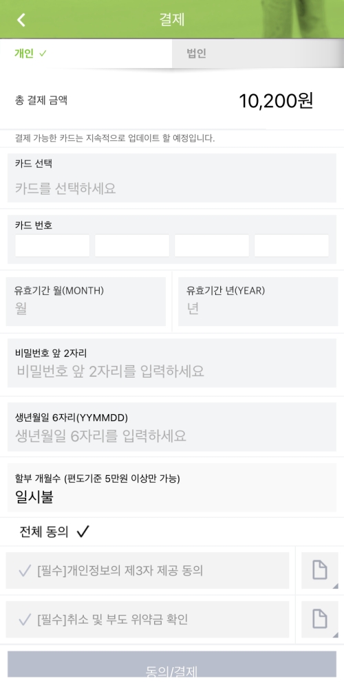 신용카드를 선택하면 카드 정보를 입력하는 화면이 나와요. 카드 번호와 유효기간, 비밀번호 앞 2자리 등 필요한 정보를 차례대로 정확하게 입력하고, 아래 약관에 동의한 뒤 '결제'를 누르면 드디어 모든 예매 과정이 끝난답니다.