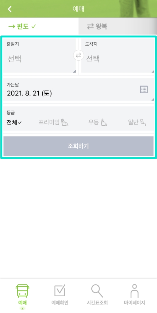 이제 본격적으로 여정을 설정할 차례예요. 출발지와 도착지, 가는 날짜를 차례대로 선택하고, 혹시 프리미엄이나 우등 버스를 선호한다면 등급도 미리 지정할 수 있어요. 모든 정보를 입력했다면 아래에 있는 '조회하기'를 눌러주세요.