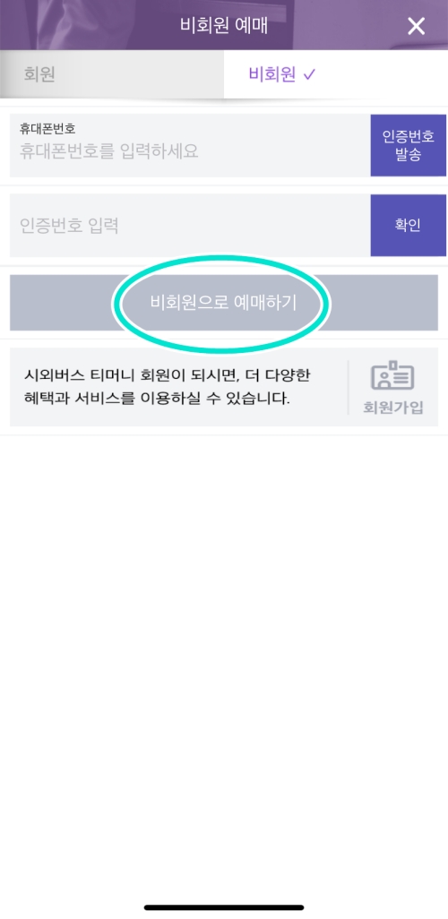 마음에 드는 시간대의 버스를 선택하면 로그인 화면이 나타나요. 자주 이용한다면 회원가입을 하는 것이 좋지만, 가끔 이용한다면 비회원으로도 충분히 예매할 수 있답니다. '비회원으로 예매하기'를 선택하고 휴대폰 번호로 간단한 인증만 거치면 된답니다.