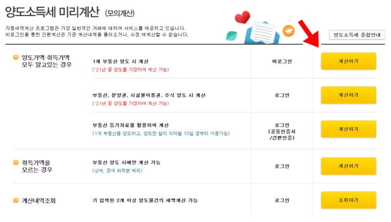 상황에 맞는 계산 방식을 골라야 하는데 1개의 부동산을 양도하는 경우라면 비로그인 방식의 계산하기를 눌러 진행하면 돼요. 취득가액을 알고 있는지 혹은 모르는지에 따라 선택지가 나뉘어 있어 본인의 상황에 딱 맞는 경로를 찾을 수 있어요. 저는 취득가액을 정확히 알고 있어서 가장 상단에 있는 항목을 통해 간편하게 시작했어요.