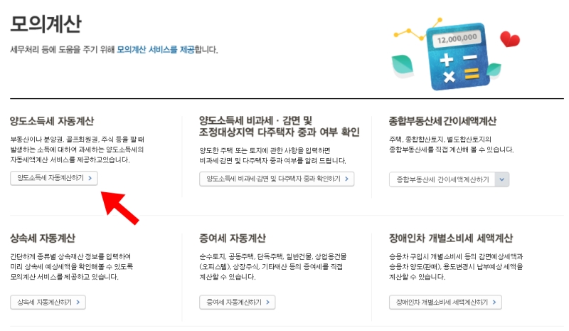 다음 화면으로 넘어가면 여러 종류의 세금 항목들이 나오는데 그중에서 양도소득세 자동계산하기 단추를 선택해 보세요. 부동산이나 분양권을 팔 때 발생하는 소득에 대해 미리 세액을 뽑아볼 수 있는 서비스예요. 제가 직접 해보니 안내 문구가 친절하게 나와 있어 처음 접하는 분들도 어렵지 않게 다음 단계로 넘어갈 수 있을 거예요.