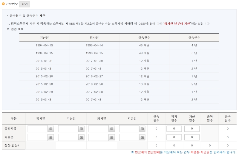 퇴직소득세 계산에서 근무 기간, 즉 '근속연수'는 세금 액수를 결정하는 매우 중요한 요소예요. 오래 일할수록 공제 혜택이 커져서 세 부담이 줄어들기 때문이죠. 이 화면에서는 퇴직금 계산이 시작된 날짜(기산일)와 실제 퇴사일을 입력합니다. 입사일과 기산일이 다른 경우도 있으니, 회사에서 받은 서류를 통해 정확한 날짜를 확인하고 입력하는 것이 필수입니다.