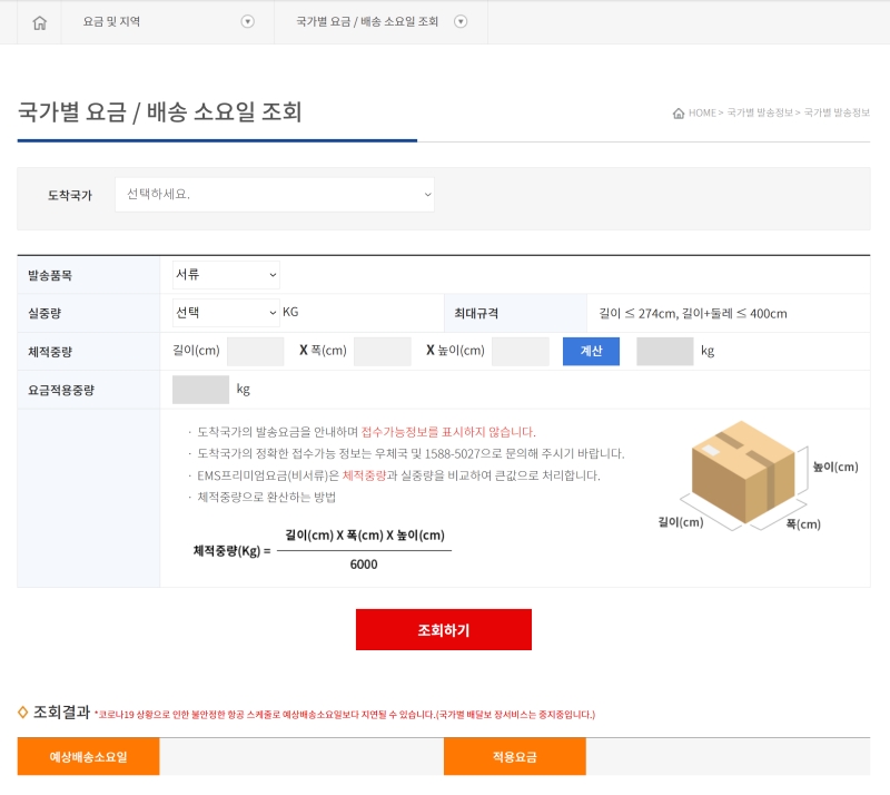 택배를 보내기 전이나, 기다리면서 대략적인 요금과 소요 기간이 궁금할 때도 있잖아요. 그럴 땐 '국가별 요금/배송 소요일 조회' 기능을 활용하면 편리해요. 도착 국가를 선택하고, 서류인지 소포인지 발송품목을 고른 뒤, 실제 중량이나 가로, 세로, 높이를 이용한 부피 중량을 입력하면 예상 요금과 배송에 걸리는 시간을 미리 알아볼 수 있어 유용합니다.