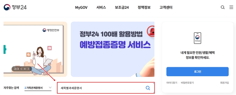 자동차세 완납증명서는 공식적으로 '지방세 세목별 과세증명서'라는 이름으로 발급돼요. 이름이 달라서 처음에는 헷갈릴 수 있지만, 이 서류를 통해 자동차세 납부 내역을 증명하는 것이니 걱정하지 마세요. 우선, 각종 민원서류를 발급받을 수 있는 '정부24' 홈페이지에 접속해 주세요. 메인 화면에 보이는 검색창에 '세목별과세증명서'라고 입력하고 검색을 시작합니다.
