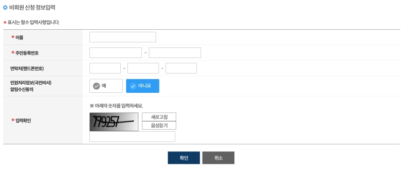 비회원 신청을 선택하면 개인정보를 입력하는 화면이 나와요. 이름과 주민등록번호, 연락처 등 필수 항목을 정확하게 기입하고, 아래에 보이는 이미지 속 숫자를 입력하는 '입력확인' 절차까지 마치면 됩니다. 개인정보를 다루는 민원 서비스이기 때문에 최소한의 본인 확인을 위한 과정이라고 생각하시면 돼요.
