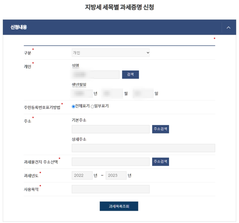 이제 본격적인 증명서 신청서 작성 화면입니다. 여기서부터가 중요한데요, 주소와 증명이 필요한 기간인 '과세년도', 그리고 '사용목적'(예: 관공서 제출, 차량 이전 등)을 꼼꼼하게 입력해 주세요. 모든 필수 항목을 채운 뒤 '과세목록조회' 버튼을 누르면, 내가 납부한 세금 내역을 불러오는 다음 단계로 넘어가게 됩니다.