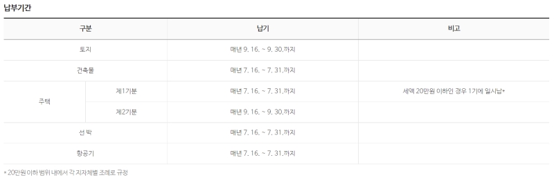 이제 가장 중요한 납부일을 알아볼 차례입니다. 재산세는 재산의 종류에 따라, 그리고 세금 액수에 따라 납부 기간이 달라져요. 건축물이나 선박, 항공기에 대한 재산세는 매년 7월 16일부터 7월 31일까지 납부합니다. 토지분은 매년 9월 16일부터 9월 30일까지가 납부 기간이에요. 우리가 가장 흔하게 내는 주택분 재산세는 1년 치 세금을 절반으로 나누어, 7월과 9월에 각각 한 번씩 납부하게 됩니다. 다만, 1년 세액이 20만 원 이하라면 7월에 한 번만 내면 됩니다.
