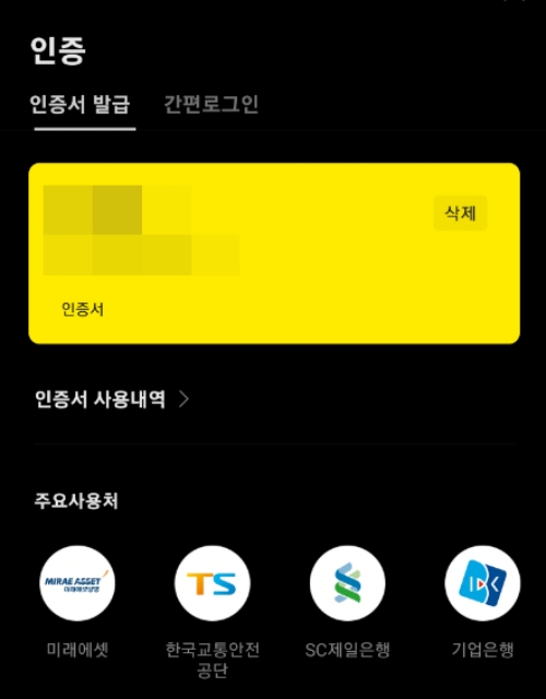 모든 과정을 마치고 나면 드디어 나만의 인증서가 발급된 것을 확인할 수 있습니다. 이제 이 노란색 인증서 카드 하나만 있으면, 연말정산 간소화 서비스나 정부24 민원 발급 등 복잡했던 본인 인증을 터치 한 번으로 간편하게 끝낼 수 있게 된 거예요. 주요 사용처들도 아래에 안내되니 참고하시면 좋습니다.