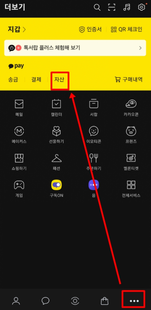 가장 먼저, 우리가 매일 쓰는 카카오톡 앱을 열어볼까요. 카카오톡을 실행한 뒤, 화면 오른쪽 맨 아래에 있는 점 세 개(...) 모양의 '더보기' 탭을 눌러주세요. 여러 메뉴가 나오는데, 여기서 상단에 있는 '자산'으로 들어가면 인증서 발급을 위한 첫 단계가 시작됩니다.