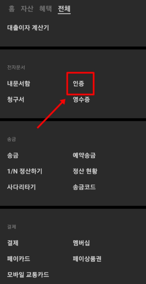 자산 관리 화면에 들어서면 송금, 결제 등 다양한 기능들이 보여서 처음에는 조금 낯설 수 있어요. 당황하지 마시고 화면을 조금 아래로 내려 '전자문서' 카테고리를 찾아보세요. 그 안에 있는 '인증' 메뉴가 바로 우리가 찾아야 할 곳입니다. 이곳을 통해 인증서를 발급받고 관리할 수 있어요.