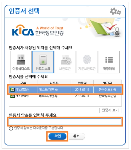 이제 본인의 인증서가 들어있는 저장 위치를 고르고 목록에서 대상을 선택한 뒤 기억나는 비밀번호를 차분하게 입력해 보세요. 저는 하드디스크나 이동식 디스크 중 어디에 두었는지 헷갈릴 때가 많았는데 차근차근 눌러보며 확인 단추를 누르니 긴장감이 최고조에 달하는 기분이었어요.