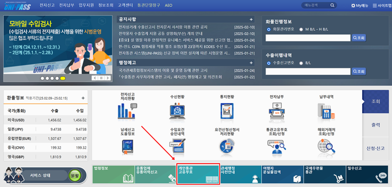 1. 유니패스 홈페이지는 관세청에서 운영하는 공식 사이트로 수출입 물품의 통관 정보와 다양한 관세 관련 서비스를 제공하는 곳이에요. 개인통관고유부호 조회나 발급은 물론 통관 진행 상황도 확인할 수 있어 해외 직구를 자주 이용하는 분들에게 유용한 사이트랍니다. 메인 하단에 있는 개인통관 고유부호 항목으로 이동해주세요.