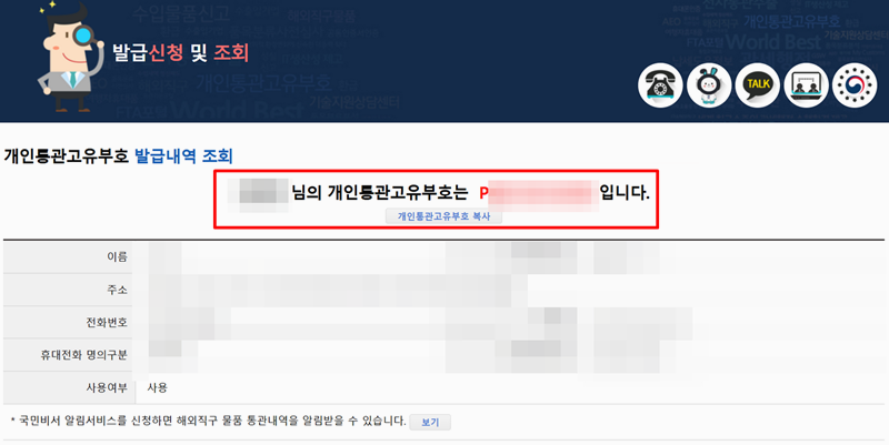 4. 인증이 끝나면 원래 받았던 개인통관고유부호 번호를 바로 볼 수 있어요. 필요할 때 쉽게 사용할 수 있도록 복사 기능을 이용해 저장해 두면 편리해요.
