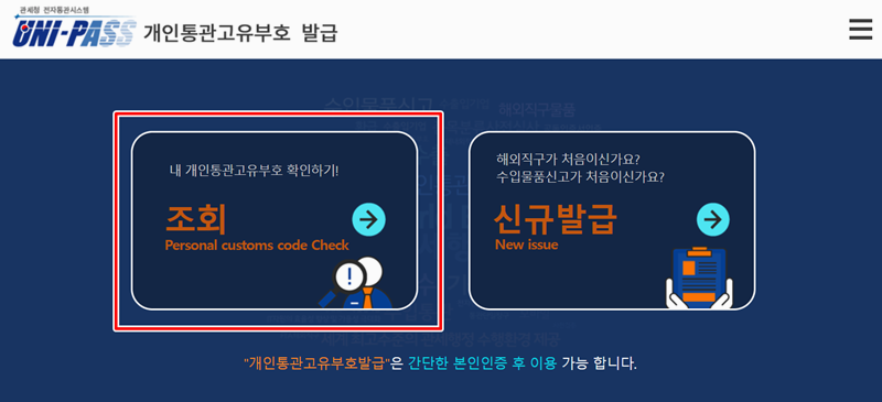 2. 그럼 개인통관고유부호 발급을 위한 페이지로 들어와지는데 내 개인통관고유부호를 찾기를 하려면 조회를 선택하시면 돼요.