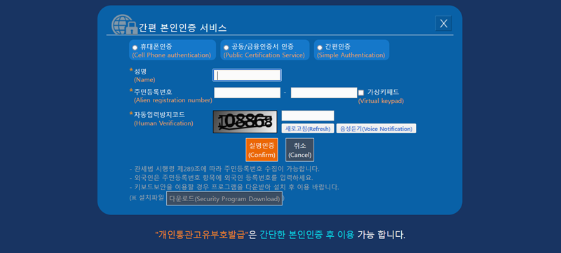 3. 개인통관고유부호를 조회하려면 간단한 본인 인증 절차를 거쳐야 해요. 본인의 정보를 입력한 뒤 실명 확인을 진행하면 되는데요. 이름과 주민등록번호를 입력한 후 원하는 인증 방법을 선택하면 돼요. 공동인증서나 휴대폰 인증 등 다양한 방식이 준비되어 있으니 편한 방법으로 인증하면 쉽게 확인할 수 있어요.