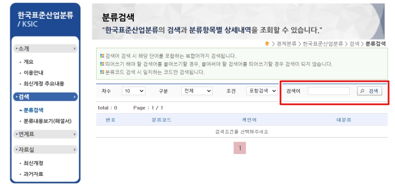 '분류검색' 페이지로 이동하면 아주 간단한 검색창이 나타납니다. 이곳은 내가 하는 일을 키워드로 검색해보는 곳이에요. 예를 들어 제가 '도로공사'와 관련된 일을 한다면, '검색어'라고 적힌 빈칸에 '도로공사'라고 입력하고 검색 버튼을 누르면 됩니다. 너무 어렵게 생각하지 마시고, 본인의 업종을 가장 잘 설명하는 단어를 입력해 보세요.