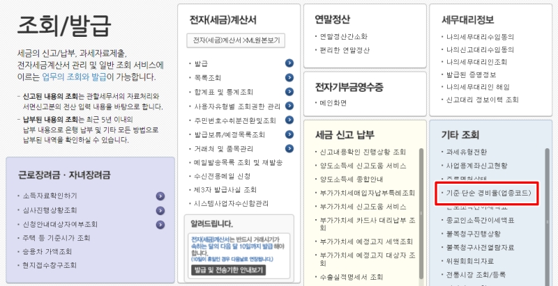 '조회/발급' 페이지는 메뉴가 정말 많아서 처음에는 조금 어지러울 수 있어요. 당황하지 마시고, 화면 오른쪽 아래에 있는 '기타 조회' 섹션을 찾아보세요. 그 안에 우리가 찾던 '기준(단순)경비율(업종코드)'이라는 메뉴가 숨어있습니다. 세금 신고에 필요한 업종코드는 바로 여기서 조회할 수 있습니다.
