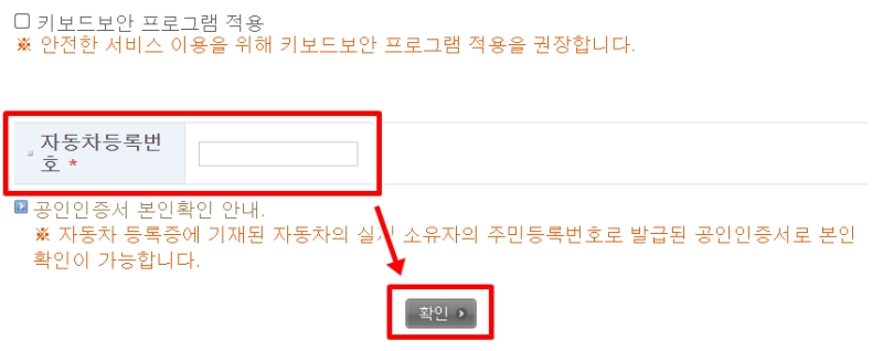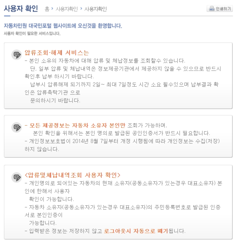 다음 화면에서는 서비스를 이용하기 전 사용자 확인을 위한 안내문이 나타납니다. 여기서 중요한 내용이 있는데, 바로 이 조회는 자동차 소유자 본인만 가능하다는 점이에요. 민감한 개인정보가 담겨있기 때문에, 본인 명의로 발급된 공동인증서(구 공인인증서)가 반드시 필요하다는 점을 기억해 주세요.