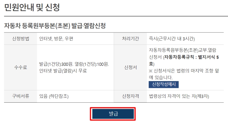 민원안내 및 신청 페이지로 이동하면, 신청 방법과 수수료 등의 정보를 확인할 수 있어요. 인터넷으로 열람하거나 발급받는 건 수수료가 무료이니 부담 없이 이용할 수 있습니다. 내용 확인 후 아래에 있는 파란색 '발급' 버튼을 누르고 본인인증 및 차량 정보 입력을 마치면, 차량의 모든 이력과 함께 압류나 저당 설정 여부를 최종적으로 확인하실 수 있습니다.