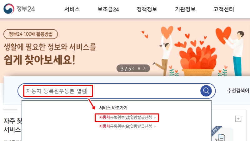 압류를 확인하는 또 다른 확실한 방법도 있습니다. 바로 자동차의 주민등록등본과도 같은 '자동차 등록원부'를 직접 확인하는 것인데요. 이를 위해 '정부24' 홈페이지에 접속한 뒤, 검색창에 '자동차 등록원부등본 열람'이라고 입력하고 검색 결과로 나온 '서비스 바로가기'를 눌러주세요.