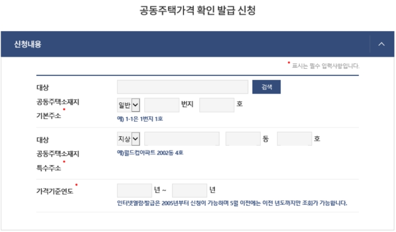 이제 발급받을 확인서의 내용을 채워 넣을 차례입니다. 가장 중요한 부분이죠. '공동주택소재지' 항목에서 주소 검색 버튼을 눌러 확인서를 발급받을 아파트나 빌라의 정확한 주소를 입력해 주세요. 그리고 어떤 연도의 공시가격을 확인할 것인지 '가격기준연도'를 지정해주시면 됩니다. 보통은 가장 최근 연도를 선택하게 되죠.