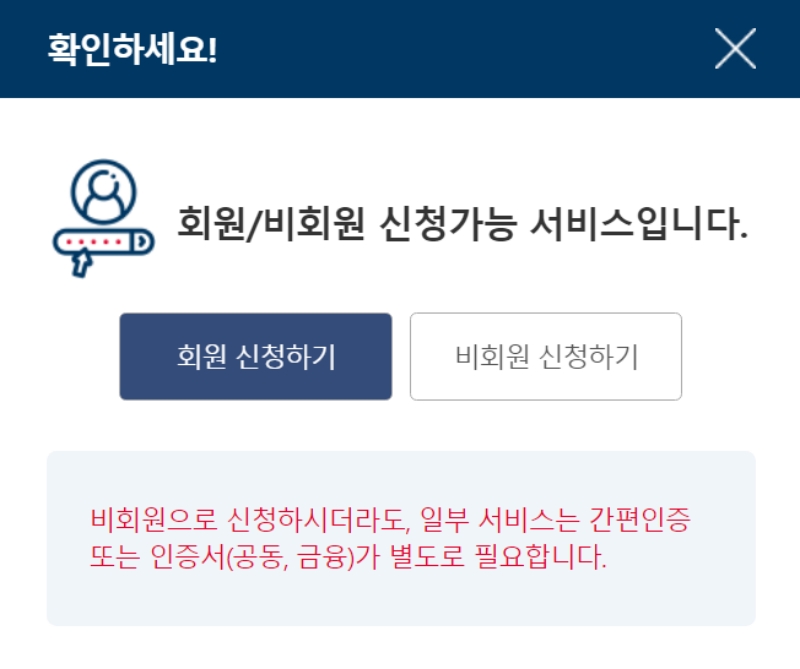 버튼을 누르면 회원으로 신청할지, 비회원으로 할지 묻는 창이 나타나요. 자주 이용하는 분이라면 회원 로그인이 편하지만, 아이디가 없어도 괜찮습니다. '비회원 신청하기'를 눌러도 모든 서비스를 동일하게 이용할 수 있으니, 저는 이 방법으로 진행해 볼게요. 다만, 비회원으로 신청하더라도 본인 확인을 위한 인증서는 필요하다는 점을 미리 알아두세요.