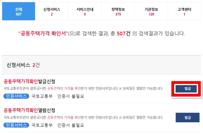 검색을 마치면 여러 결과가 나올 수 있는데, 여기서 당황하지 마시고 '신청서비스' 항목을 찾아보세요. 우리가 필요한 것은 서류를 열람하는 것이 아닌, 직접 출력해서 제출할 수 있는 '발급' 서비스예요. '공동주택가격확인발급신청' 항목 오른쪽에 있는 파란색 '발급' 버튼을 눌러 다음 단계로 넘어가면 됩니다.