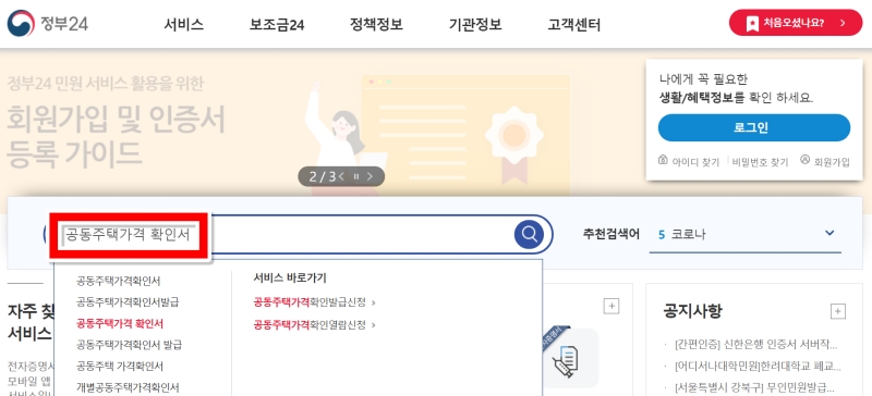 필요한 서류가 생기면 어디부터 가야 할지 막막할 때가 있죠. 이럴 땐 인터넷 검색창에서 '정부24'를 찾아 홈페이지에 접속하는 것이 가장 빠른 방법이에요. 홈페이지 중앙에 있는 검색창에 우리가 발급받으려는 서류의 이름, '공동주택가격 확인서'를 정확하게 입력하고 검색을 시작해 주세요.