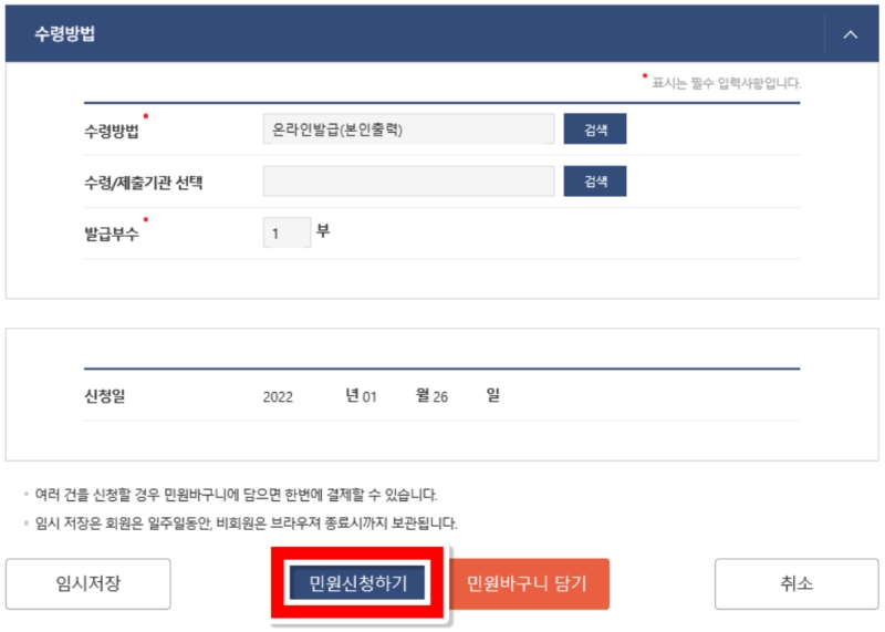 신청서 작성이 거의 끝나갑니다. 화면을 아래로 내려 '수령방법'이 '온라인발급(본인출력)'으로 되어 있는지 확인해 주세요. 집에서 바로 프린터로 출력할 수 있는 가장 편리한 방법이에요. 발급 부수를 확인한 뒤, 마지막으로 파란색 '민원신청하기' 버튼을 누르면 모든 신청 절차가 마무리됩니다.