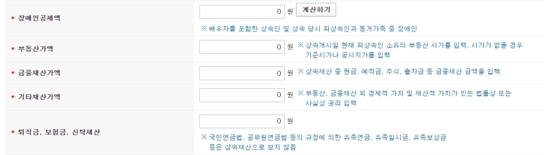 다음은 상속받을 재산의 총액을 입력하는 단계입니다. 물려받을 '부동산가액', '금융재산가액' 등 각 재산의 종류별로 대략적인 금액을 입력해 주세요. 만약 부동산의 정확한 시가를 모를 경우에는, 공시지가를 기준으로 입력해도 대략적인 계산이 가능합니다. 이외에 알고 있는 다른 재산이 있다면 '기타재산액'에 포함해 주세요.