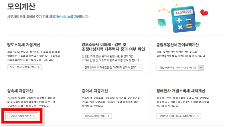 '모의계산' 페이지로 들어오면 양도소득세, 증여세 등 다양한 세금 계산기가 보이는데요, 우리는 상속세를 계산할 것이므로 화면을 조금 내려 '상속세 자동계산' 항목을 찾아야 합니다. 찾으셨다면 바로 아래에 있는 '상속세 자동계산하기' 버튼을 눌러 다음 단계로 이동해 주세요.