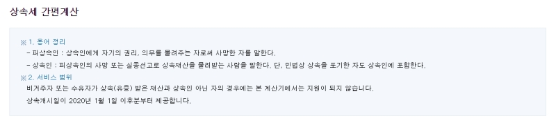 상속세 계산에는 두 가지 방법이 있어요. 모든 서류를 갖추고 정확하게 계산하는 '자동계산'과, 간단한 정보만으로 대략적인 금액을 확인하는 '간편계산'이죠. 우리는 대략적인 세액을 알아보는 것이 목적이므로, '상속세 간편계산' 부분에 있는 노란색 '간편계산하기' 버튼을 눌러보겠습니다.