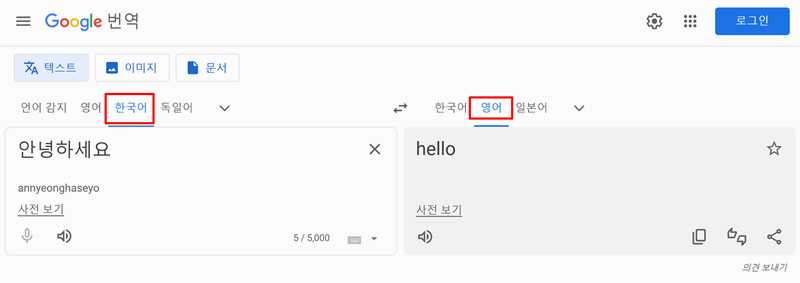 그럼 자동으로 영어로 변환이 되는데 여기서 번역할 내용을 왼쪽에서 한글로 적으면 자동으로 영어로 변환이 됩니다.