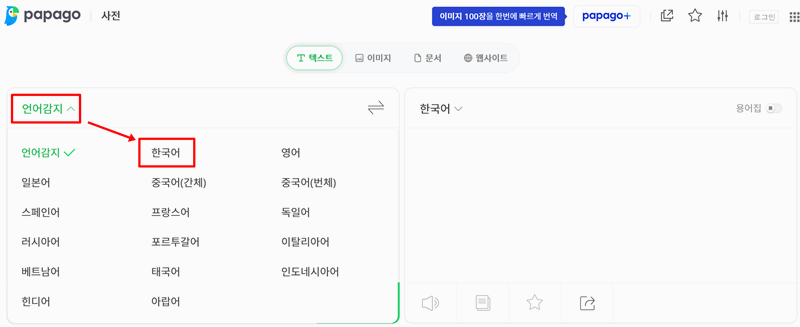 파파고는 한국어 기반 번역이 강점이라서 한글을 영어로 변환할 때 비교적 정확한 결과를 얻을 수 있어요. 파파고 사전에서 언어감지를 누르고 한글을 선택해보세요.